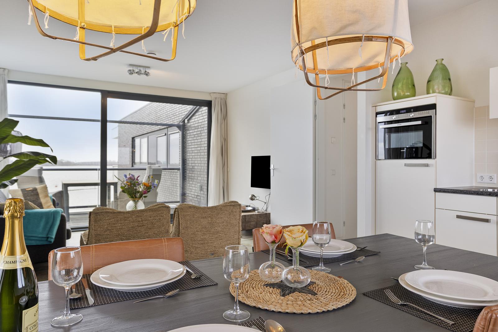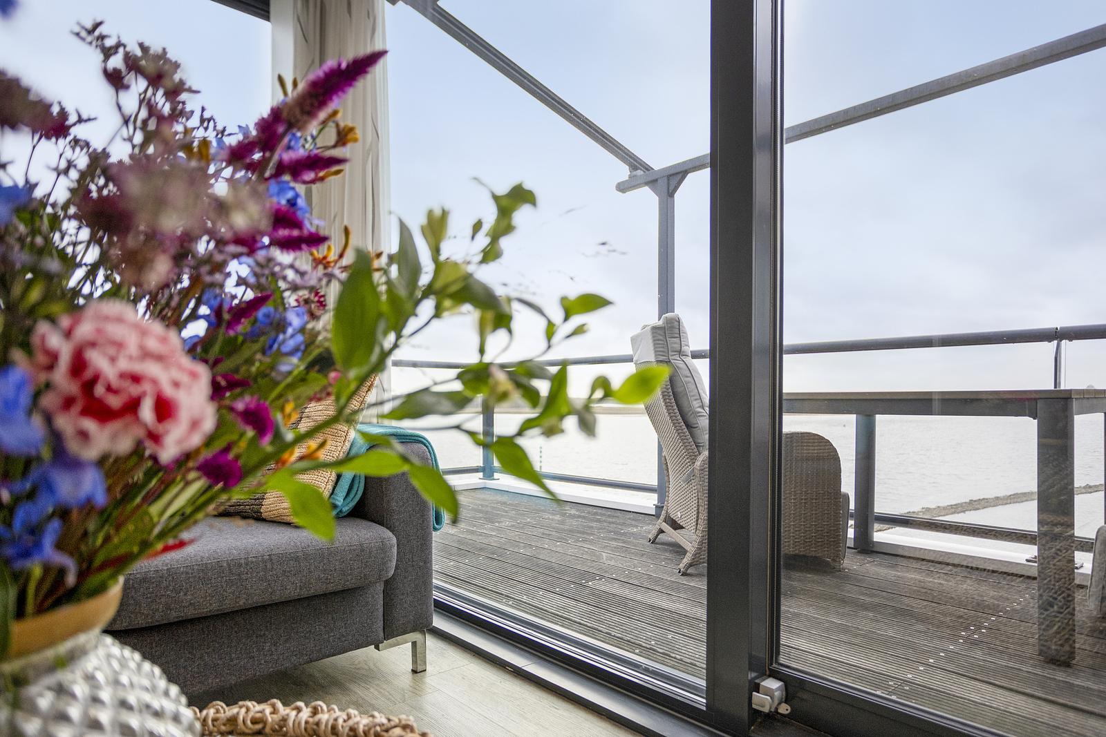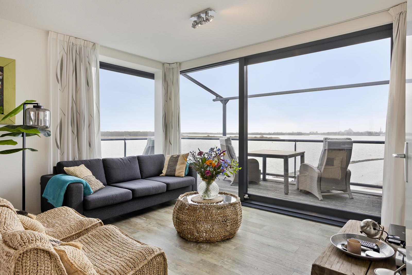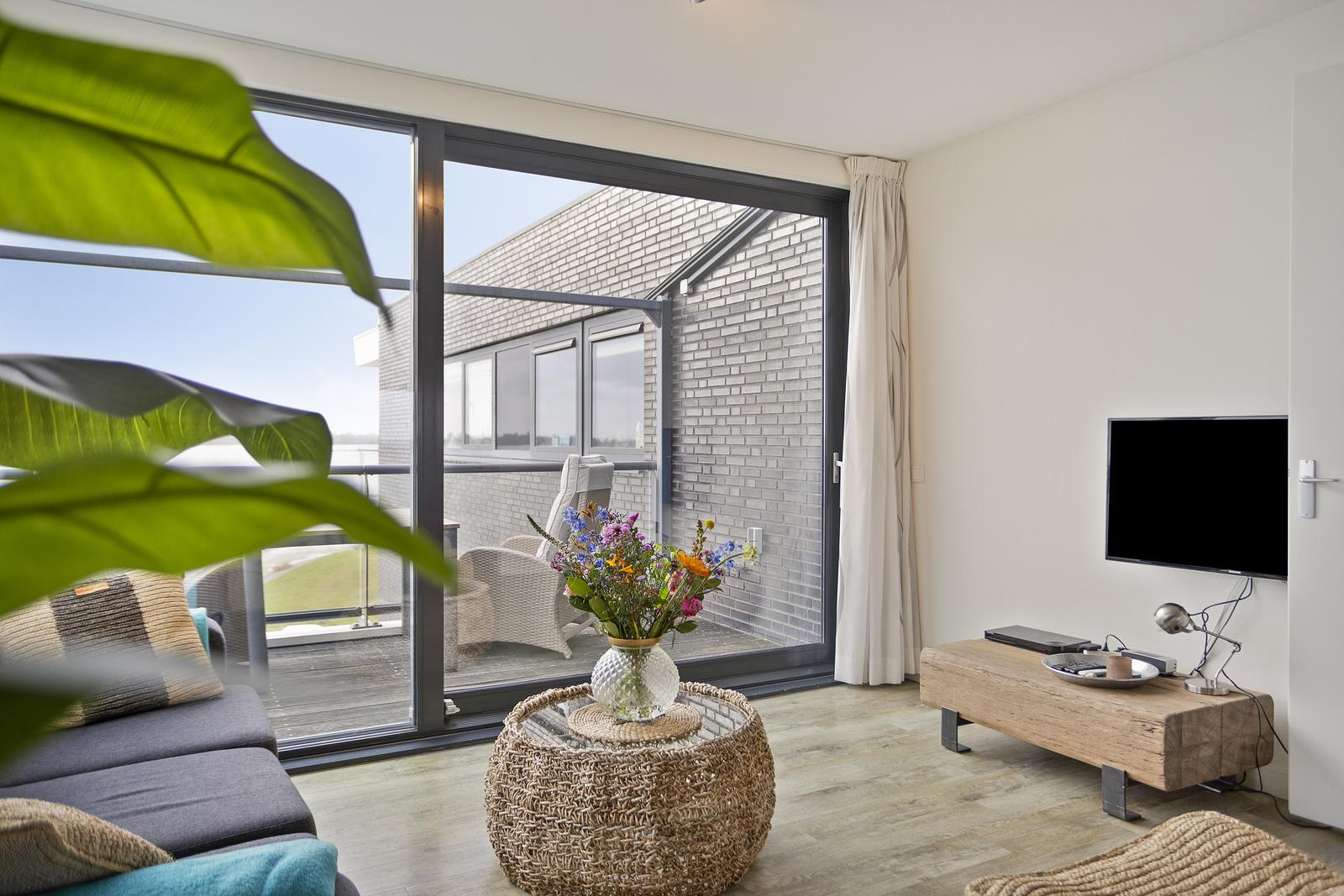 Uniek gelegen 4-persoons vakantie-appartement op de topetage (3e verdieping) met schitterend weids uitzicht rondom, als je goed kijkt zie je de hertjes op het Haringvreter-eiland lopen!
